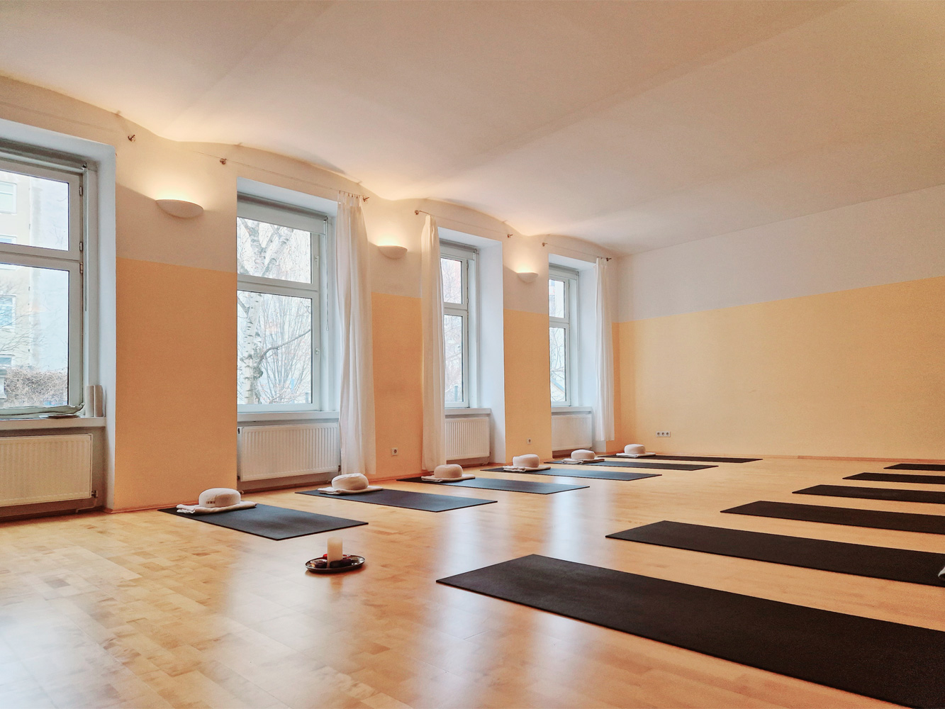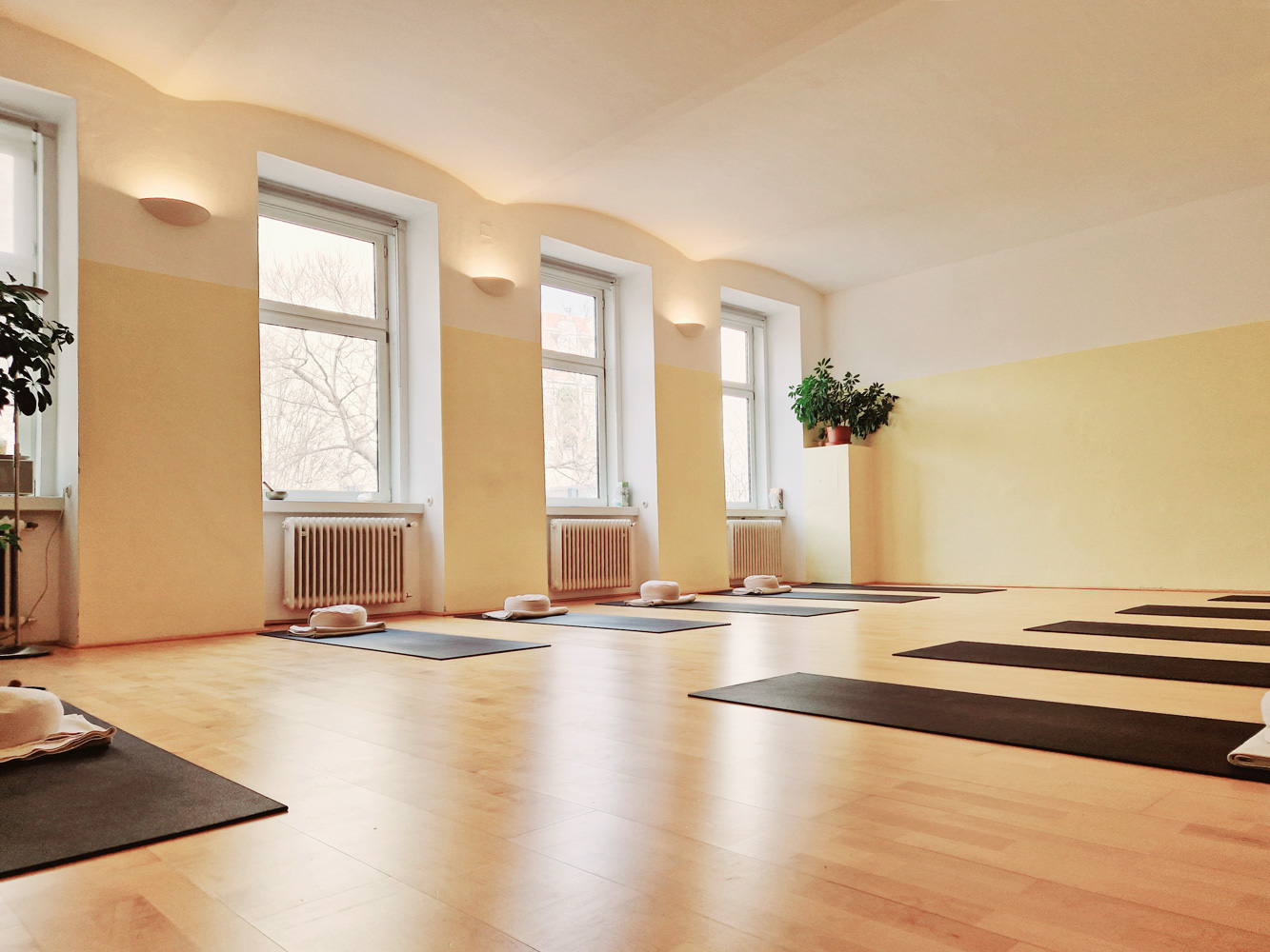 Unsere Räumlichkeiten sind mit Yogamatten, Sitzkissen, Decken, Flipcharts, Yogablöcken und Yogagurten ausgestattet.